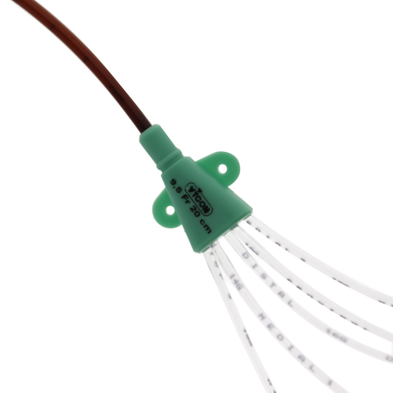 It consists of 5 lumens completely separated on the total length of the catheter. Each lumen leads, at the distal tip of the catheter, to a distinct hole. At the proximal end, the lumens of the catheter are connected to extension tubes of different lengths. Each extension tube includes a different coloured hub and is marked “Distal”, “Medial 1”, “Medial 2”, “Medial 3” and “Proximal” so as to identify easily the different infusion lines.