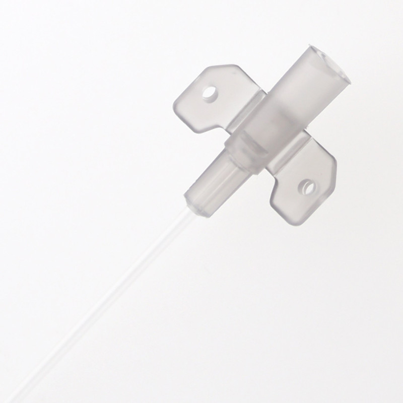 Short polypropylene intravenous catheter, radiation sterilised, with winged hub mounted on trocar needle. The distal end of the cannula is tapered to facilitate its penetration into the skin and vein and the proximal end comprises a female Luer-lock connector. The hub of the puncture needle comprises a chamber for display of the blood reflux that occurs when the needle bevel penetrates into the vessel to be cannulated.Available in 3 sizes: 16, 14 and 13G